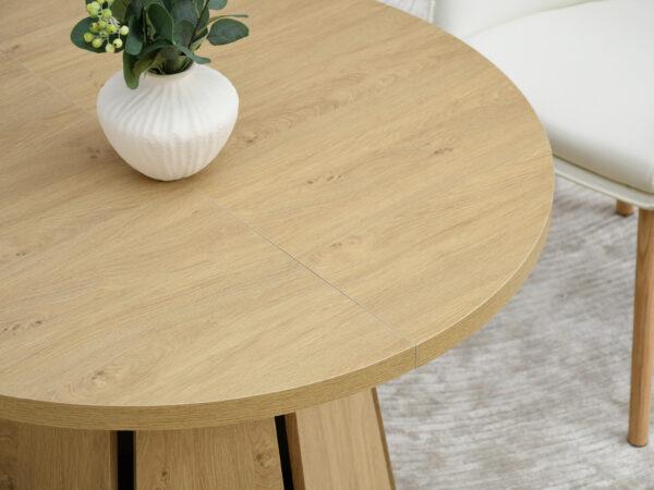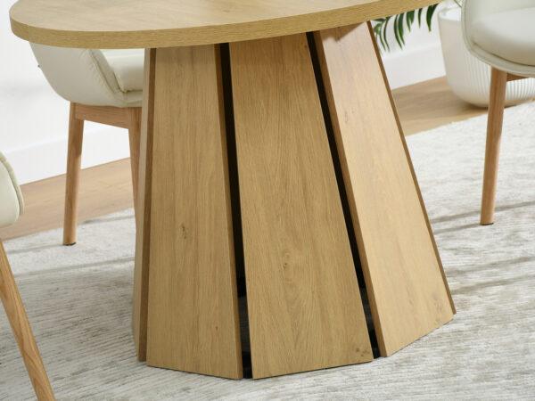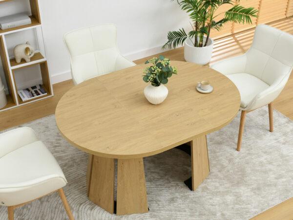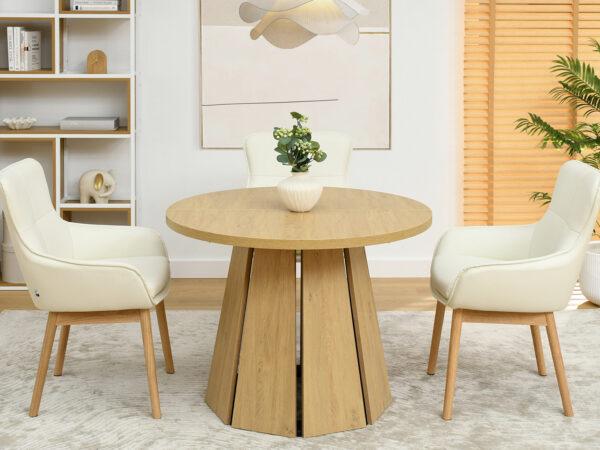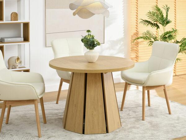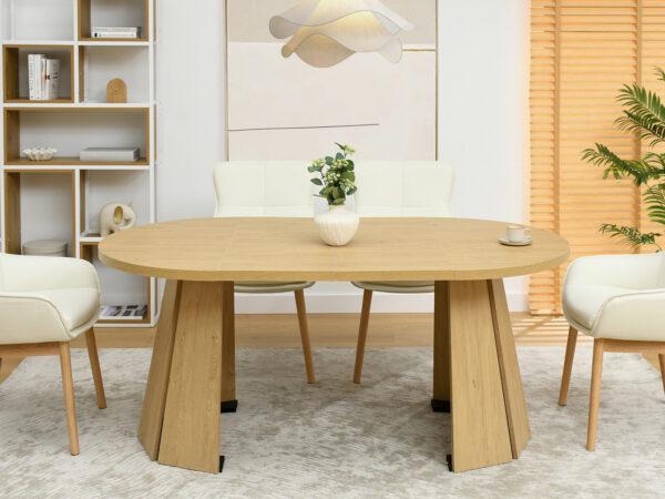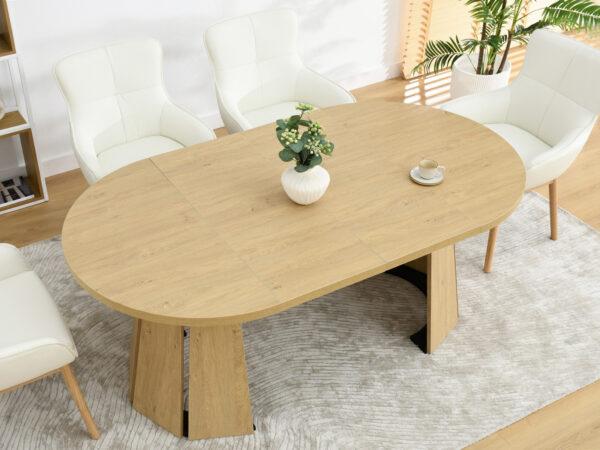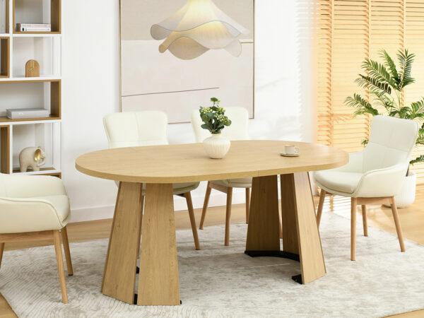 Blagovaonski stol Marketa savršeno se uklapa u moderne, minimalističke i industrijske interijere. Njegova završna obrada u boji hrasta i jednostavan oblik s geometrijskom bazom daju mu karakter loft stila koji se lijepo stapa s drvom i metalom. Istovremeno, njegov elegantan izgled čini ga savršenim dodatkom svakom prostoru gdje su estetika i funkcionalnost ključne.