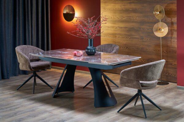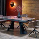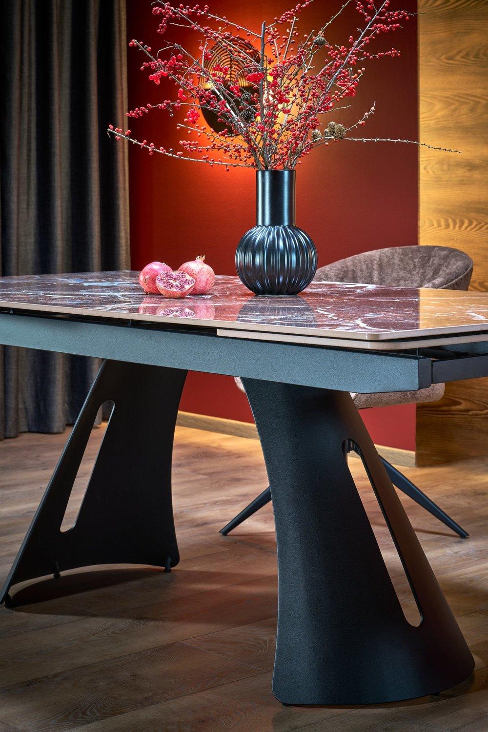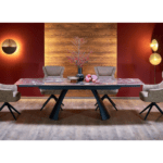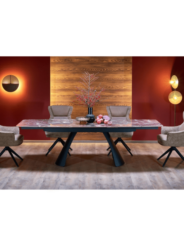 Stol Marvin sa sinteriranom kvarcnom pločom u elegantnoj bordo nijansi donosi spoj modernog dizajna i vrhunske izdržljivosti. Površina inspirirana mramorom otporna je na ogrebotine, toplinu i svakodnevnu upotrebu. Zahvaljujući funkciji razvlačenja, stol je idealan za svakodnevno korištenje i veća okupljanja. Stabilna baza od crnog čelika s praškastim premazom daje mu čvrstoću i moderan izgled.