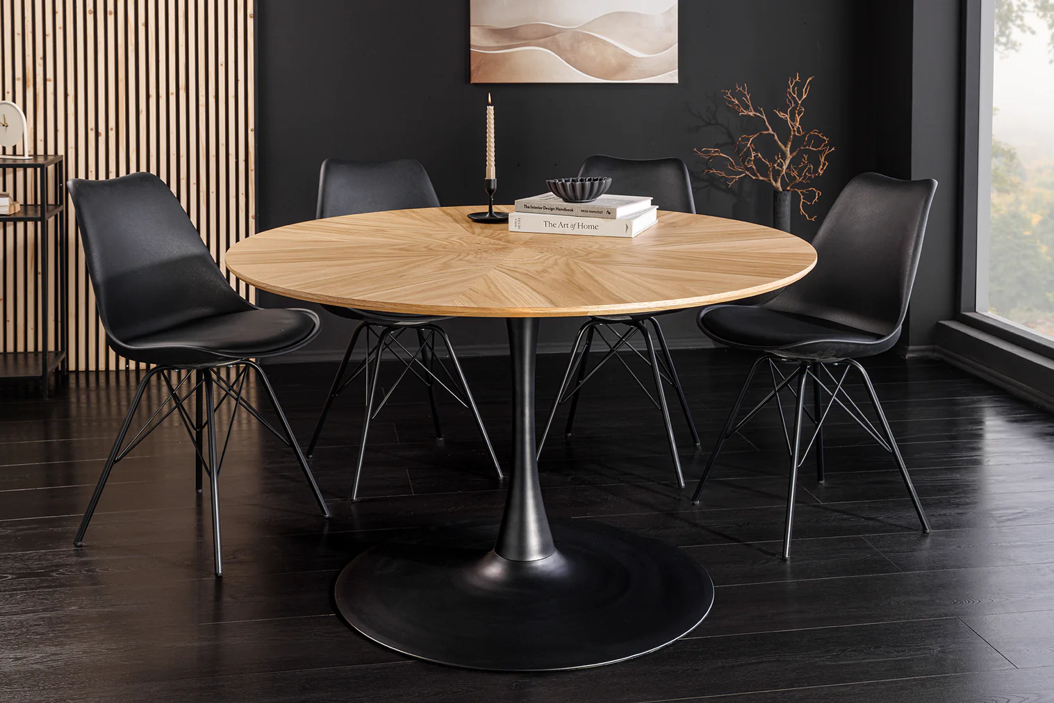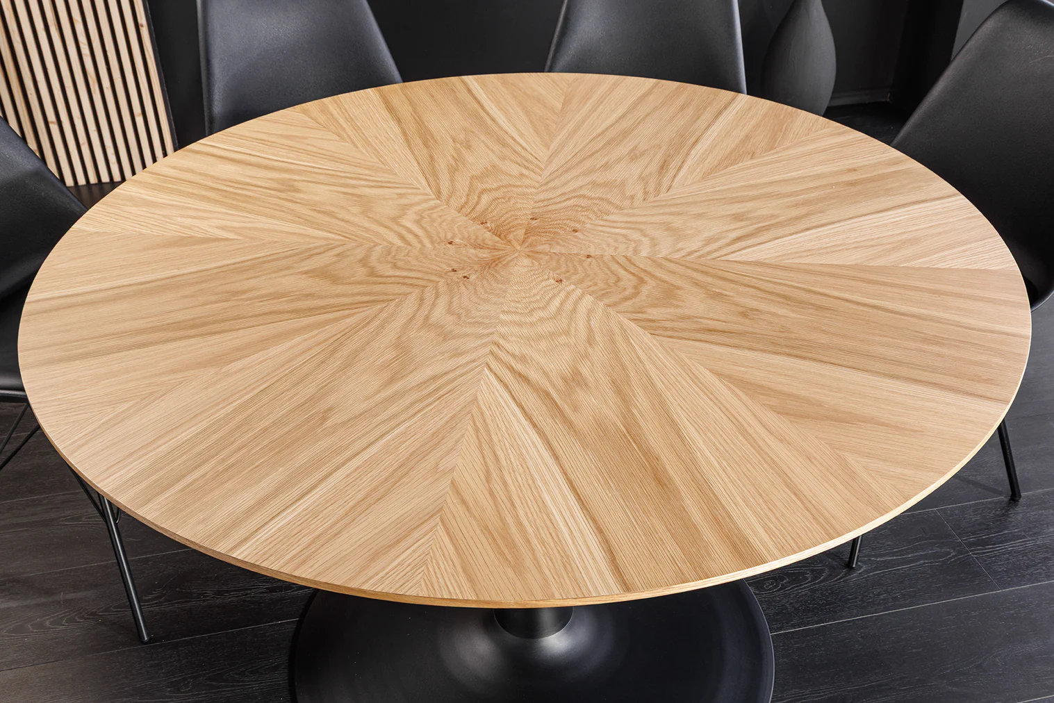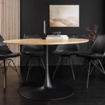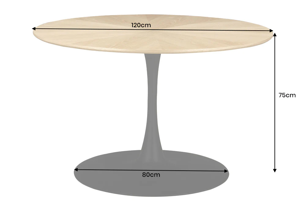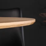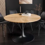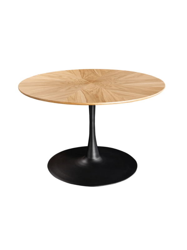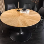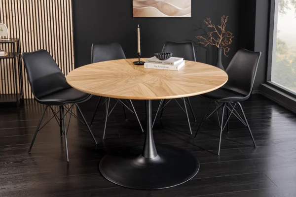Okrugli blagovaonski stol Nairi spaja topli hrastov furnir s elegantnim metalnim postoljem, čineći svaki obrok posebnim.