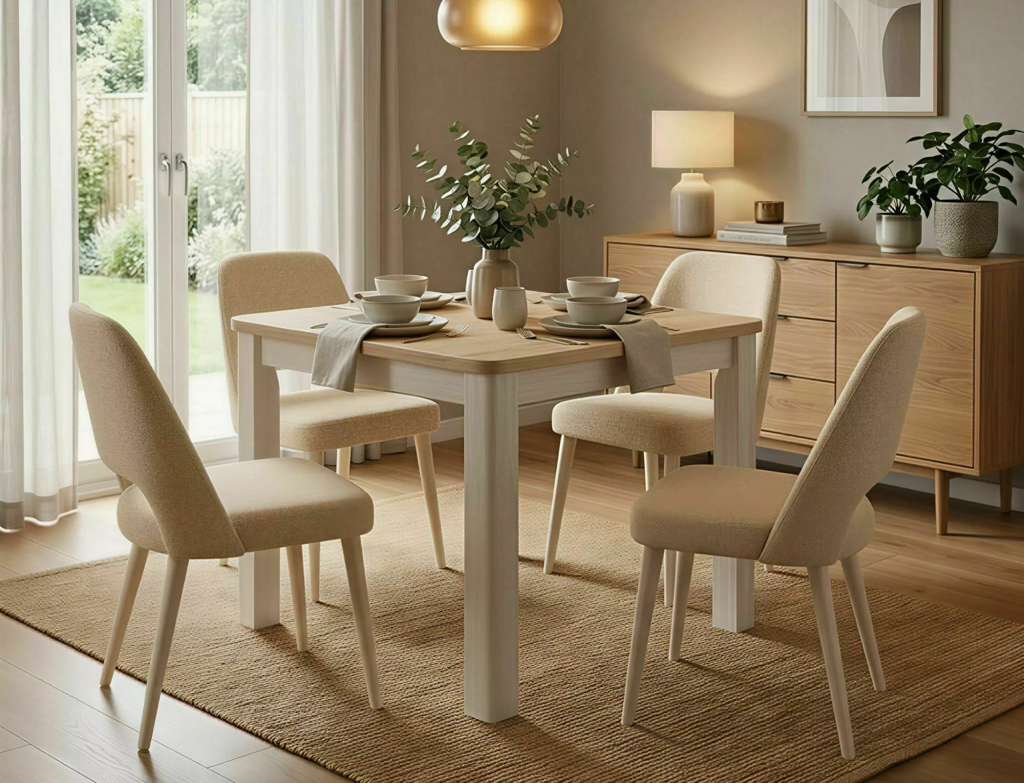 Stol na razvlačenje modernog dizajna u kombinaciji hrasta i mat bijele boje unosi eleganciju i toplinu u svaki prostor. Ploča je izrađena od laminirane ploče, dok je okvir od MDF-a, što osigurava stabilnost i jednostavno održavanje. Stol dolazi s dva umetka od 60 cm za proširenje, koji se pohranjuju odvojeno.