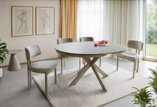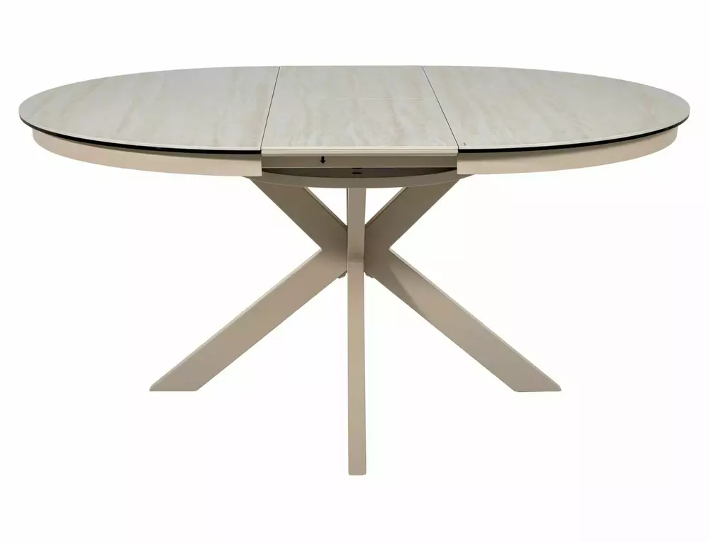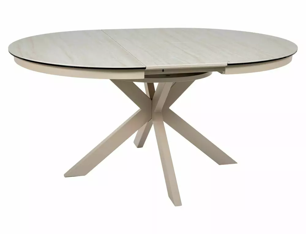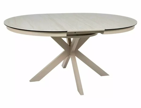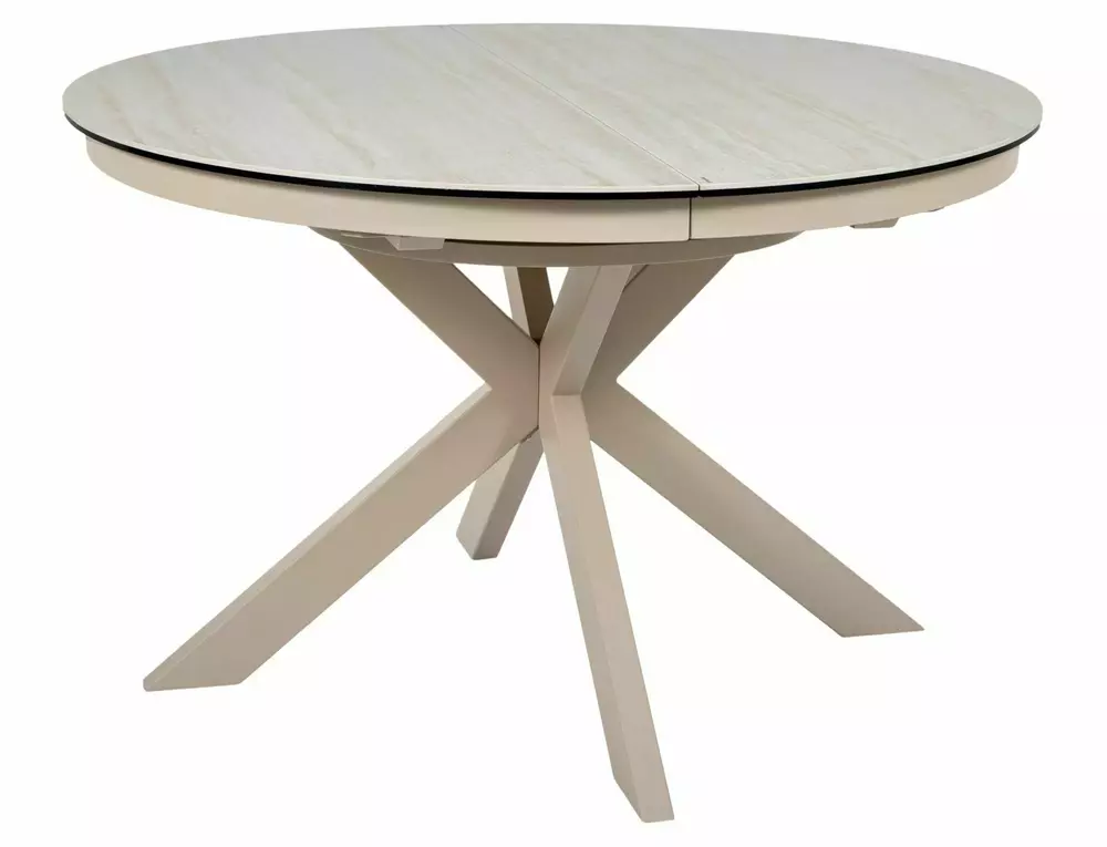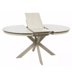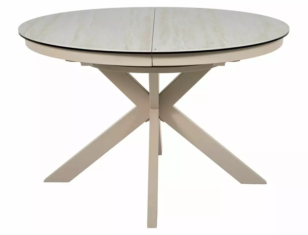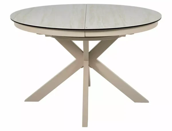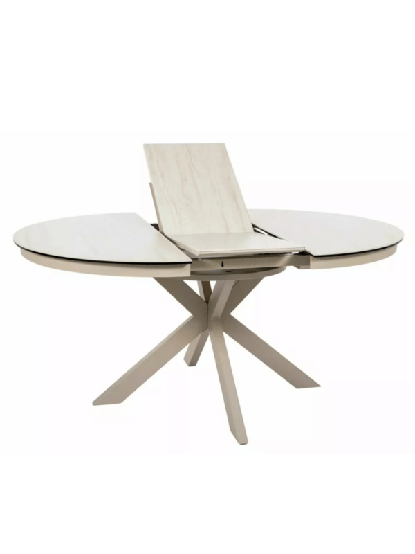 Blagovaonski stol Port izrađen je od dvoslojne ploče koju čine travertin keramika i kaljeno staklo. Ploča stola je okruglog oblika u promjeru 120 cm i moguće ju je razvući do 160 cm. Postolje je metalno i u kombinaciji s pločom daje stolu iznimnu čvrstoću. Postolje je križnog oblika, a keramička ploča bit će odličan izbor za ljubitelje modernih interijera.