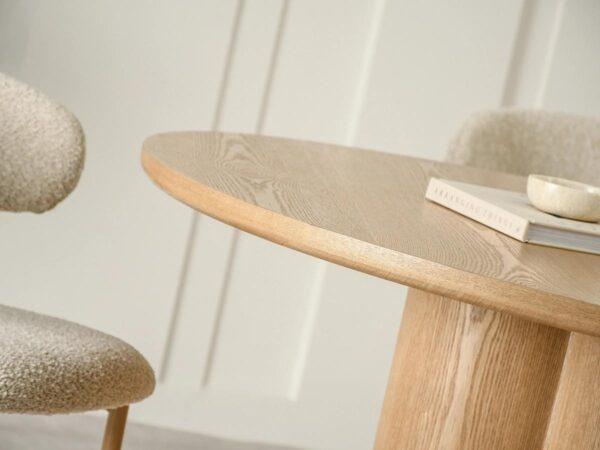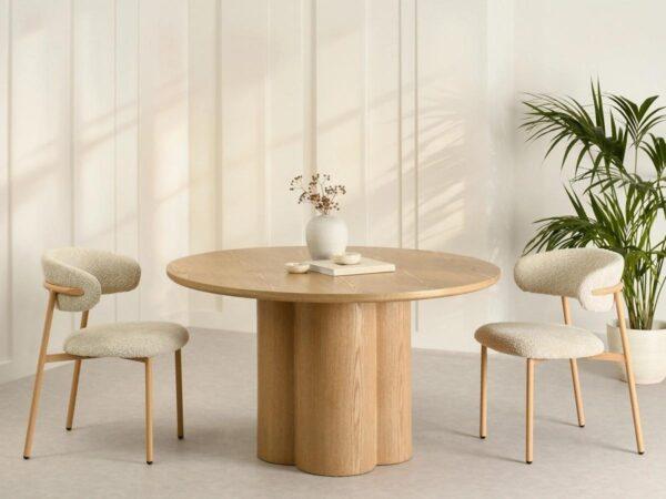 Blagovaonski stol Sinaloa II evocira japandi stil i savršeno se uklapa u razne interijere, od ugodnih dnevnih soba do modernih poslovnih prostora. Prirodna boja hrasta usklađuje se sa svijetlim i prigušenim nijansama, a minimalistički oblik olakšava kombinacije s raznolikim teksturama: mikrocementom, prirodnim lanenim tkaninama ili boucléom.