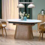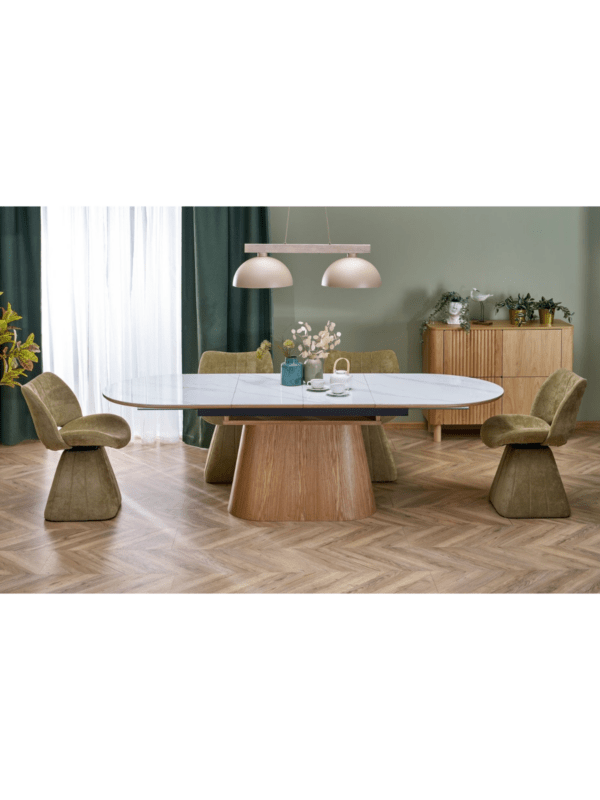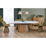 Sorina stol s ovalnom pločom elegantan je dodatak blagovaonici ili dnevnom boravku, kombinirajući prirodne materijale s modernim dizajnom. Ploča stola izrađena je od sinteriranog bijelog mramora, koji se može pohvaliti suptilnom teksturom i bezvremenskom estetikom. Funkcija proširenja čini stol savršenim i za svakodnevnu upotrebu i za veća okupljanja.