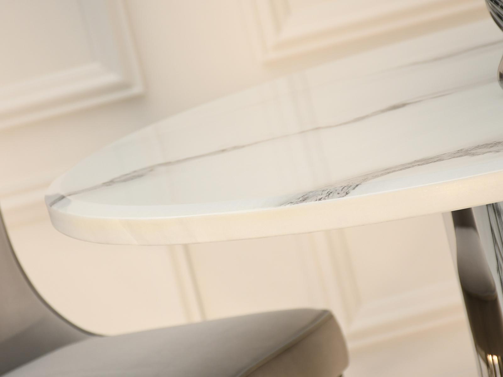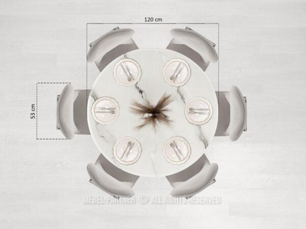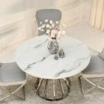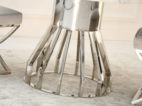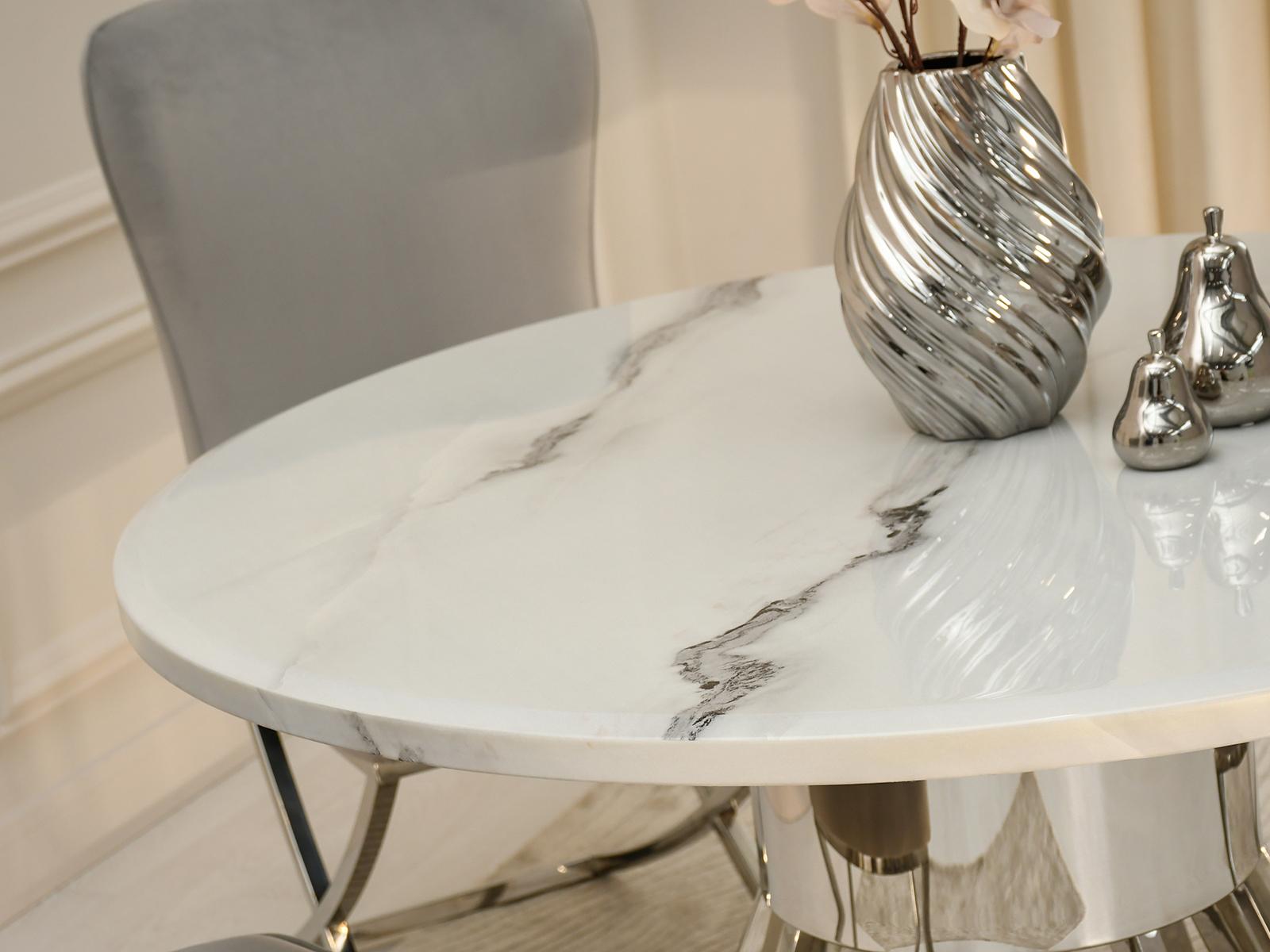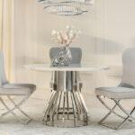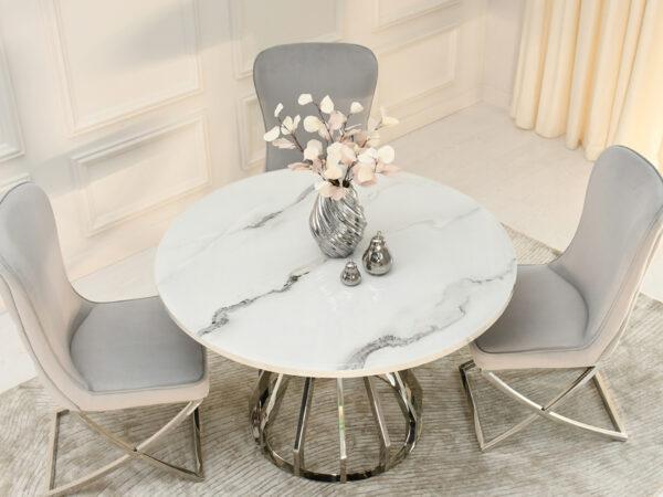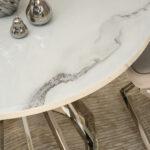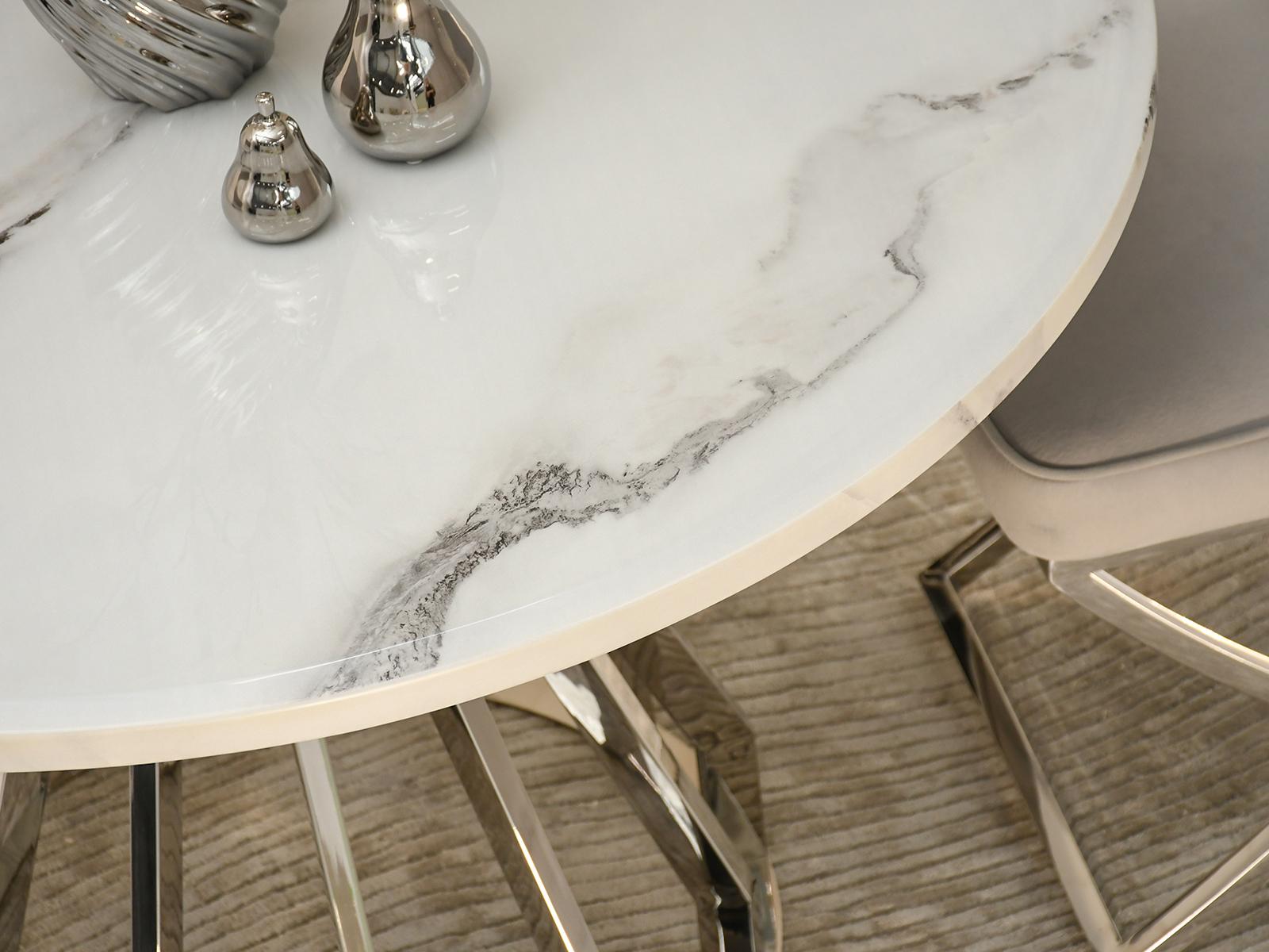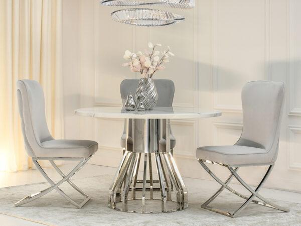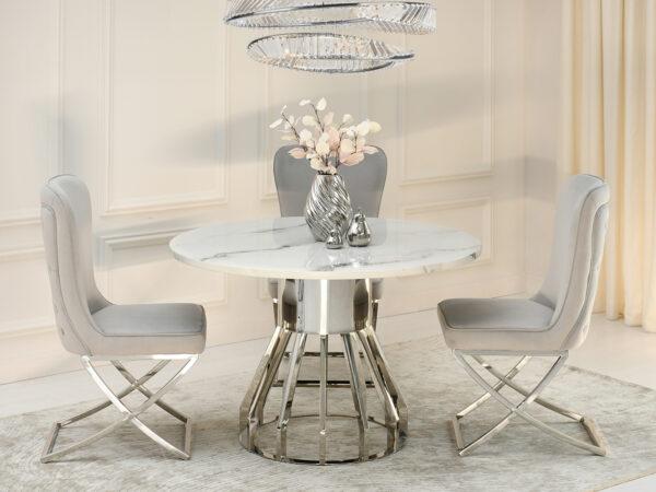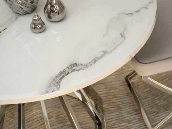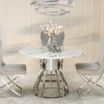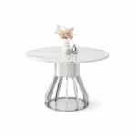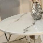 Blagovaonski stol Tanatos je elegantan komad namještaja koji će izgledati savršeno i u kućnoj blagovaonici i u modernom restoranu. Njegova okrugla bijela mramorna ploča, u kombinaciji s blistavom kromiranom bazom, stvara luksuzan i bezvremenski dizajn. U dnevnom boravku, stol će postati središnja točka za okupljanja uz obroke ili razgovore s voljenima.