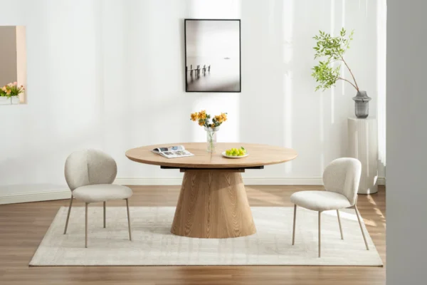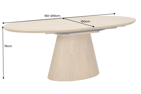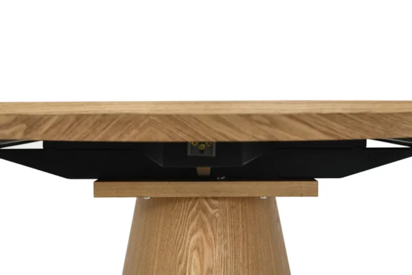 Blagovaonski stol Vies sastoji se od MDF ploče prekrivene prekrasnim hrastovim furnirom, što mu daje izdržljivost i profinjen izgled. Jedinstvena baza izrađena od istog materijala kao i ploča te pruža stabilnost.