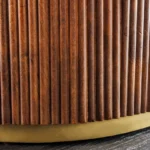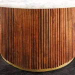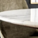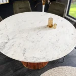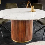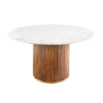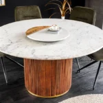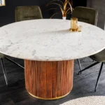 Blagovaonski stol Yeona promjera 140 cm savršeno se uklapa u trenutne trendove uređenja interijera. Letvičasta baza daje stolu jedinstven karakter, čineći ga središtem pažnje u svakoj blagovaonici, a ploča izrađena od metala u imitaciji mramora unosi notu profinjenosti.