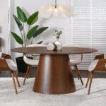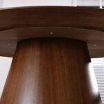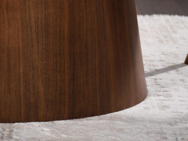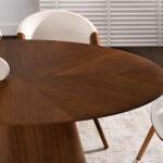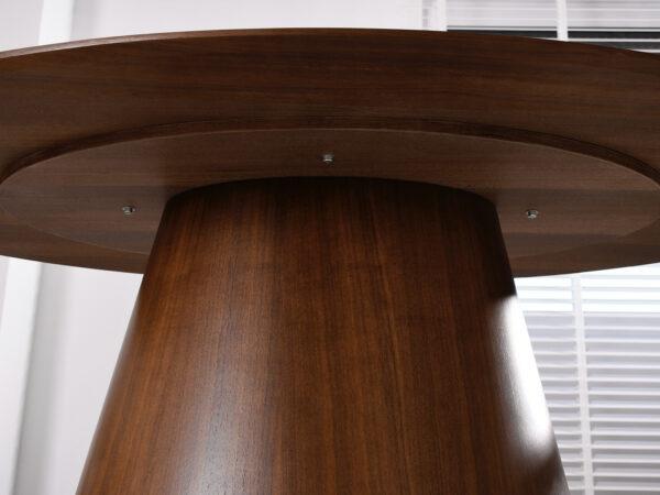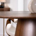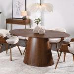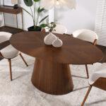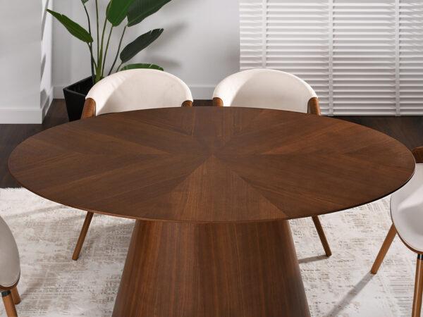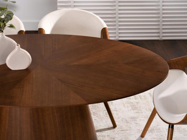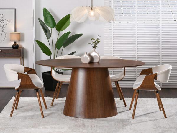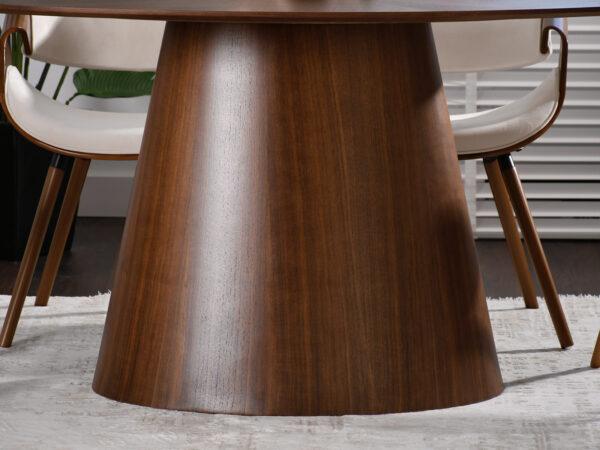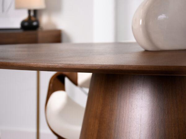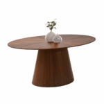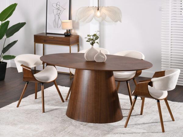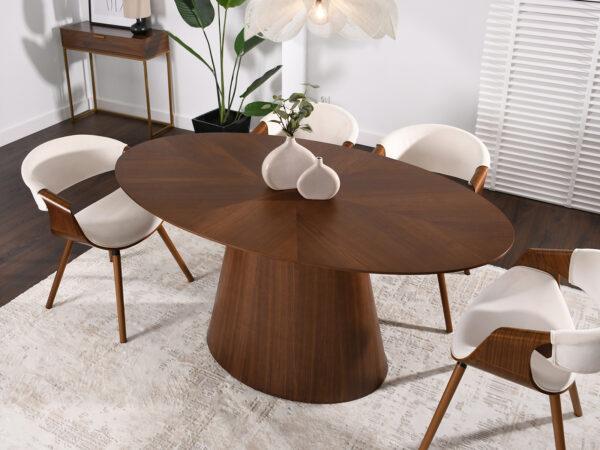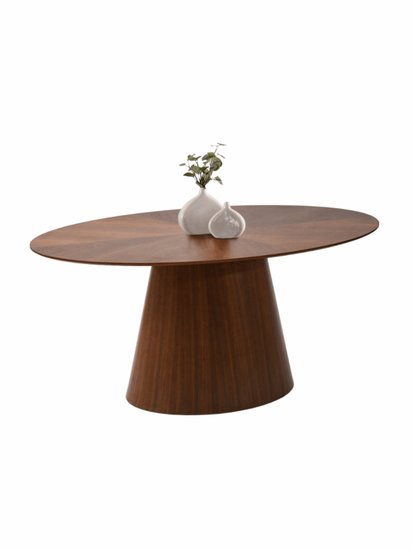 Blagovaonski stol Zafira ističe se ovalnim oblikom i elegantnom pločom u bogatoj nijansi oraha. Stabilna baza u obliku stošca čini ga idealnim izborom za one koji cijene minimalistički stil i visoku kvalitetu izrade u uređenju blagovaone ili dnevnog boravka.