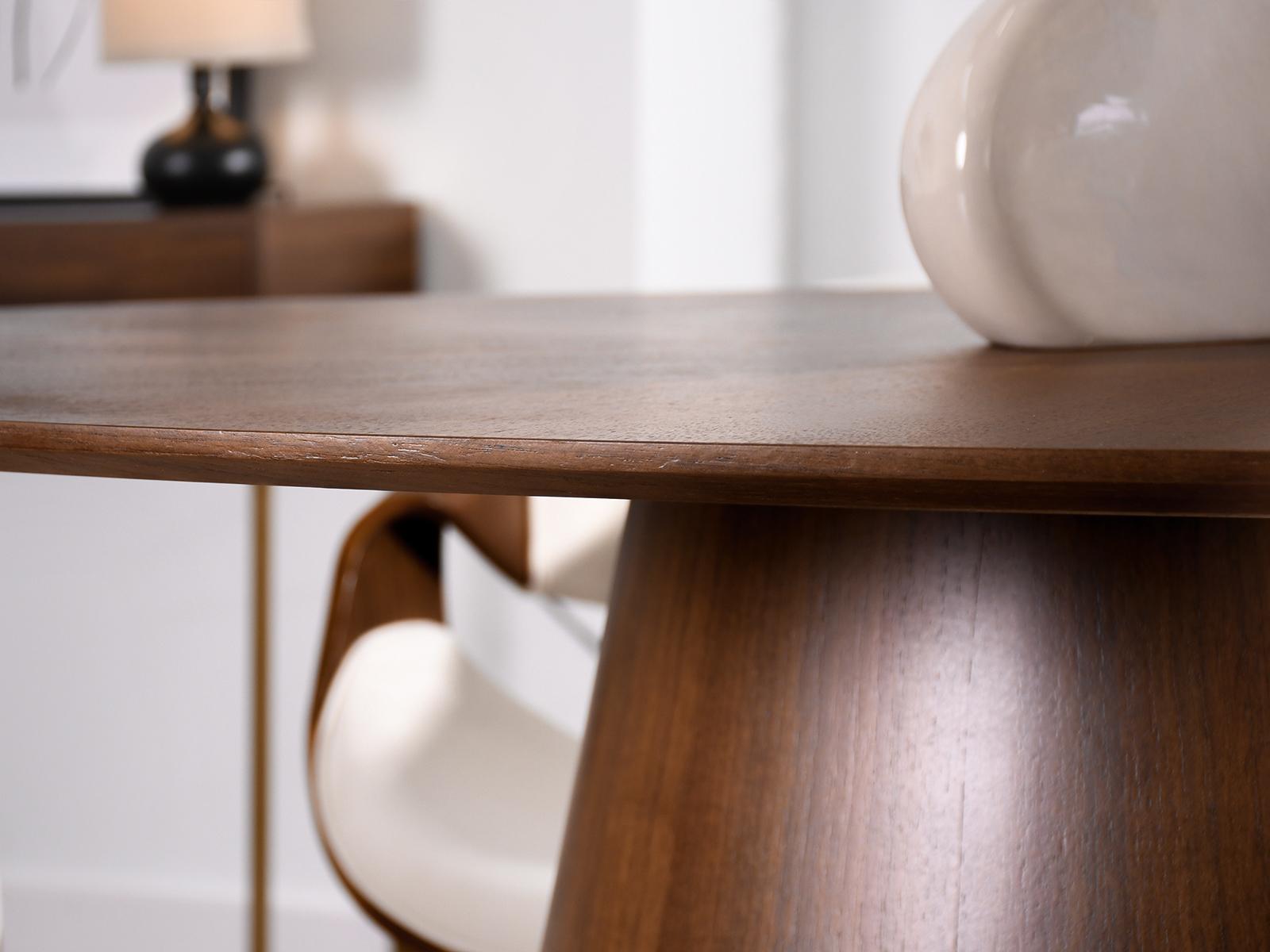 Blagovaonski stol Zafira ističe se ovalnim oblikom i elegantnom pločom u bogatoj nijansi oraha. Stabilna baza u obliku stošca čini ga idealnim izborom za one koji cijene minimalistički stil i visoku kvalitetu izrade u uređenju blagovaone ili dnevnog boravka.