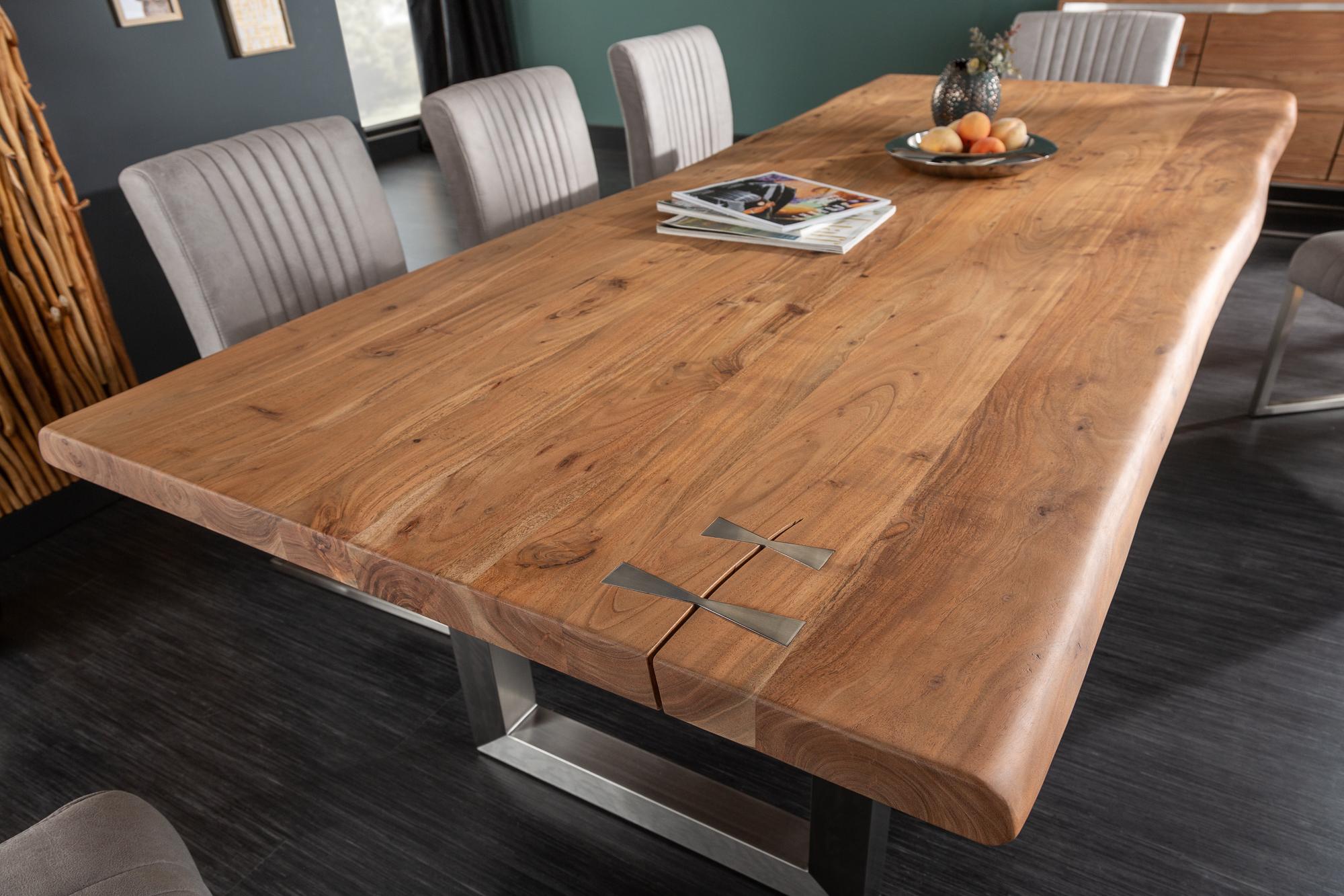 Ručno izrađeni stol od punog drveta bagrema sa izraženim detaljima u drvetu od nehrđajućeg čelika koji će se savršeno uklopiti u Vašu blagovaonicu.