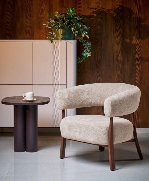 Moderna fotelja suvremenog dizajna odlikuje se zaobljenim linijama i bogato podstavljenim sjedalom koje pruža visoku razinu udobnosti. Presvučena je kvalitetnom tkaninom koja doprinosi ugodnom i elegantnom izgledu. Idealan izbor za dnevni boravak ili prostor za opuštanje.