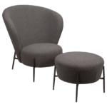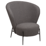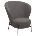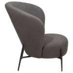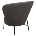 Fotelja ima luksuzan izgled s okruglim, mekanim sjedalom i naslonom presvučenim recikliranom boucle tkaninom sive boje. Elegantan dizajn fotelje crne metalne noge boje starinskog kositra koje dodaju dodir sofisticiranosti i podižu cjelokupan dizajn.