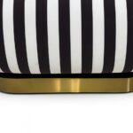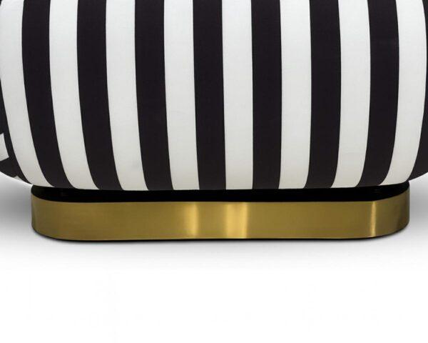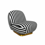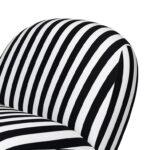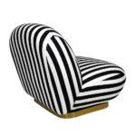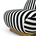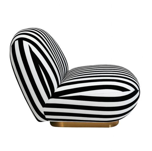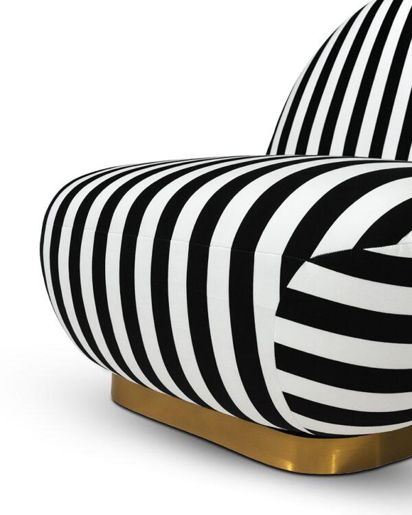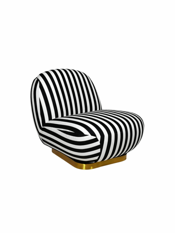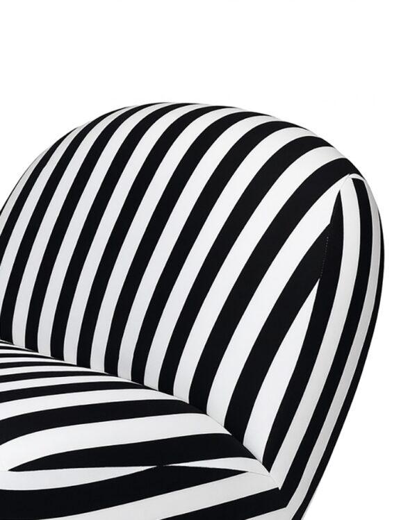 Fotelja Rayures upečatljiv je komad namještaja koji privlači poglede dinamičnim crno-bijelim prugastim uzorkom. Poliesterska presvlaka ugodna je na dodir i otporna na svakodnevnu upotrebu, dok zaobljeni oblik sjedala i naslona osigurava visoku udobnost sjedenja. Stabilna čelična baza sa zlatnom završnom obradom dodaje eleganciju i moderan karakter. Ugrađeni okretni mehanizam čini fotelju ne samo atraktivnom već i funkcionalnom.