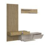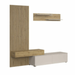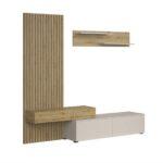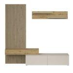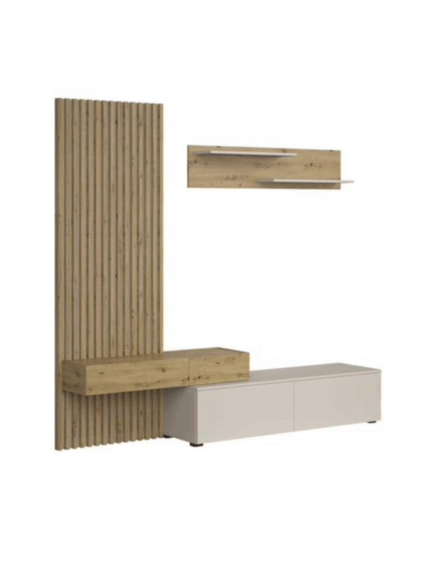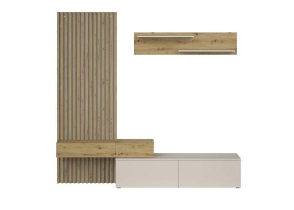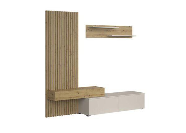 Garnitura za dnevni boravak Monomi kombinacija je elegancije i funkcionalnosti koja će unijeti toplinu i moderan karakter u vaš interijer. Prirodna nijansa artisan hrasta savršeno se uklapa sa suptilnom bojom kašmira, stvarajući skladnu i ugodnu kompoziciju. Namještaj je izrađen od izdržljive plastificirane ploče debljine 16 mm što osigurava dugotrajnost i jednostavnost održavanja, a moderan push-to-open sustav omogućuje otvaranje fronta bez ručki.