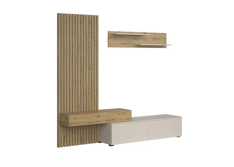 Garnitura za dnevni boravak Monomi kombinacija je elegancije i funkcionalnosti koja će unijeti toplinu i moderan karakter u vaš interijer. Prirodna nijansa artisan hrasta savršeno se uklapa sa suptilnom bojom kašmira, stvarajući skladnu i ugodnu kompoziciju. Namještaj je izrađen od izdržljive plastificirane ploče debljine 16 mm što osigurava dugotrajnost i jednostavnost održavanja, a moderan push-to-open sustav omogućuje otvaranje fronta bez ručki.