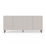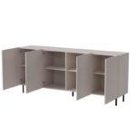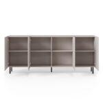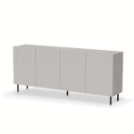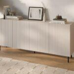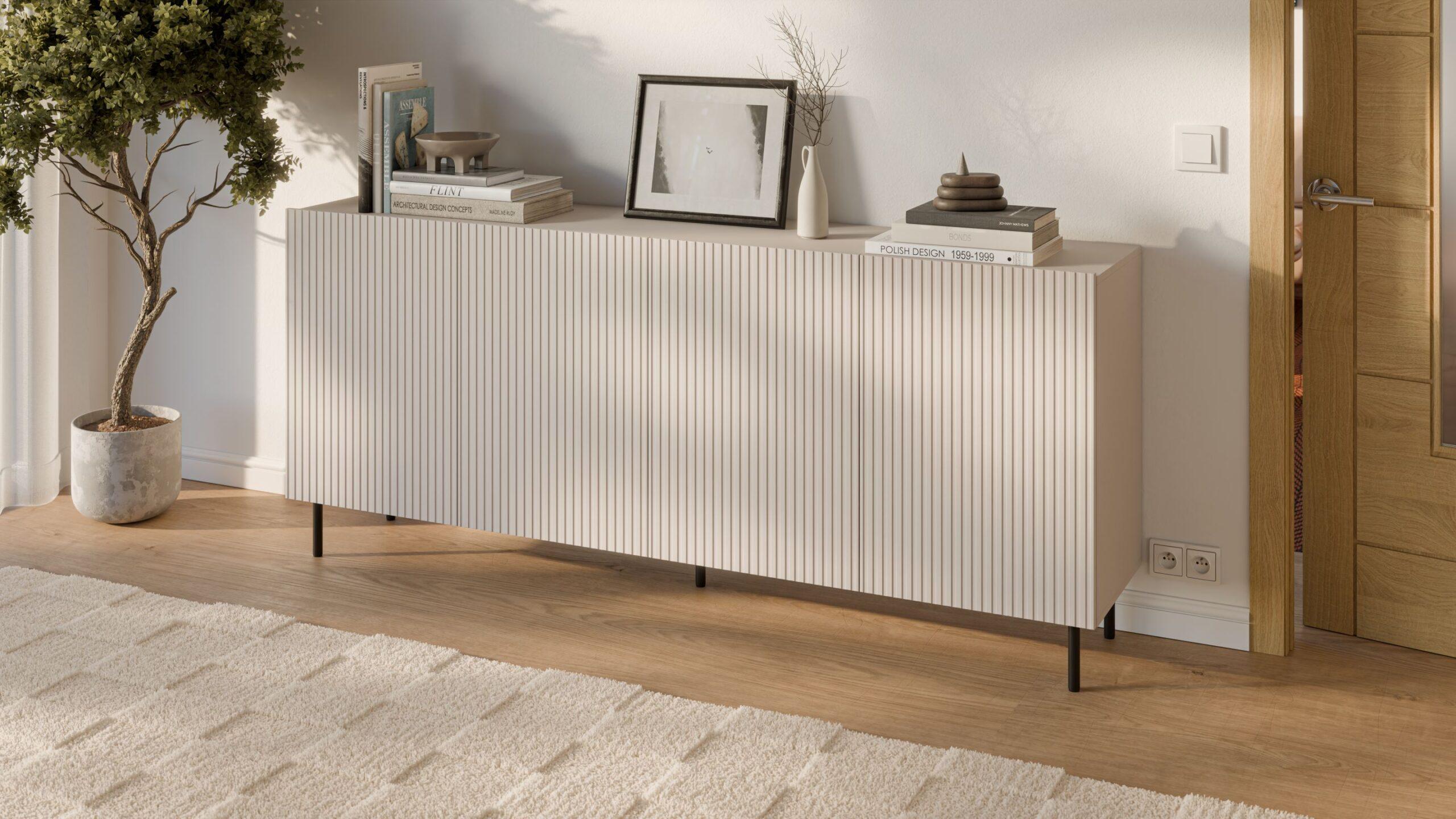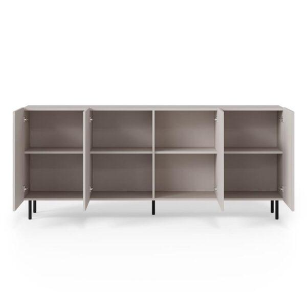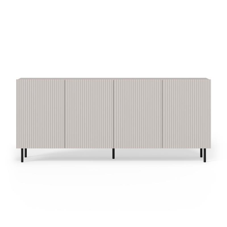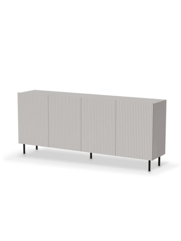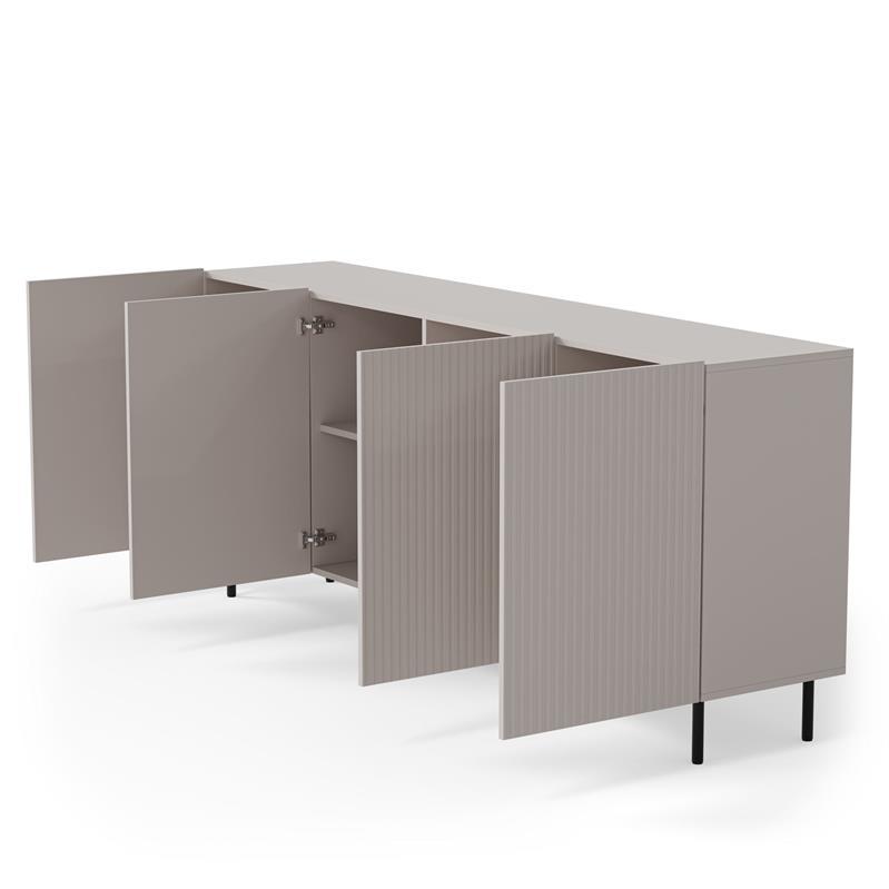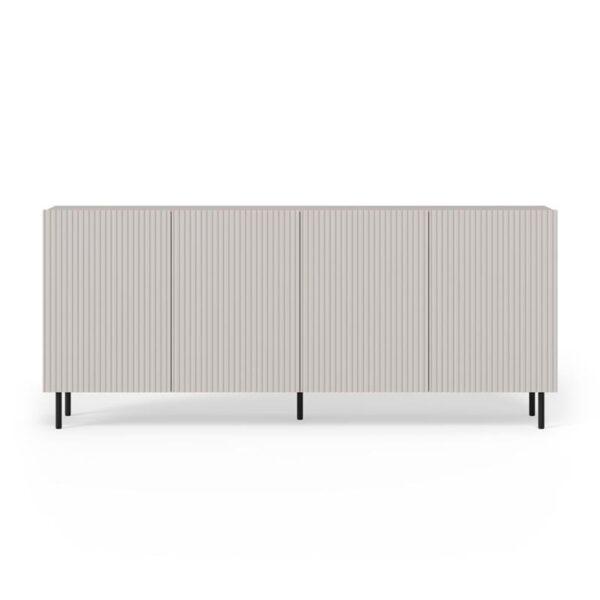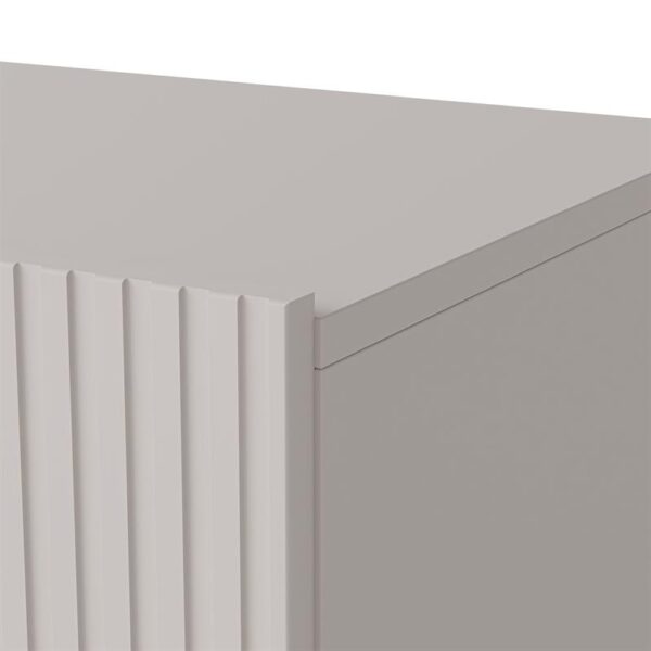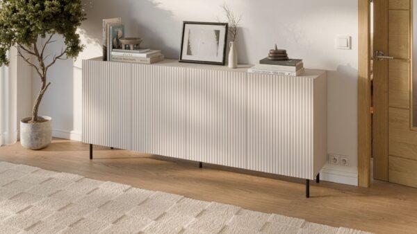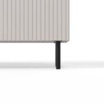 Komoda Helsa ističe se prepoznatljivim žljebovima koji joj daju moderan i nježan izgled. Korišteni materijali uključuju laminiranu ploču za namještaj, MDF obložen folijom i čelik s praškastim premazom. Svaki od ovih materijala osigurava trajnost, jednostavnost čišćenja i otpornost na svakodnevnu upotrebu, dok paleta boja u tonu kašmira čini namještaj izvrsnim za različite stilove uređenja interijera.