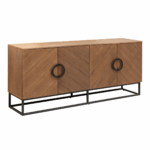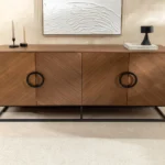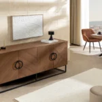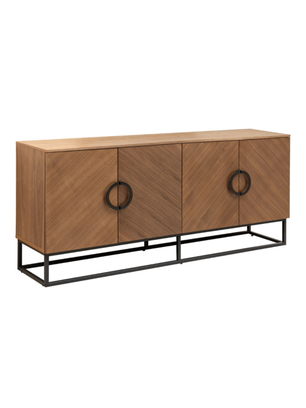 Komoda Keon je stvorena za ostavljanje utiska. S bogatim furnirom oraha i odvažnim crnim metalom, savršena je kombinacija stila i funkcionalnosti.