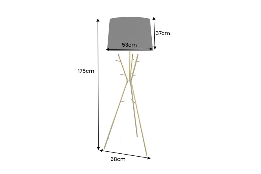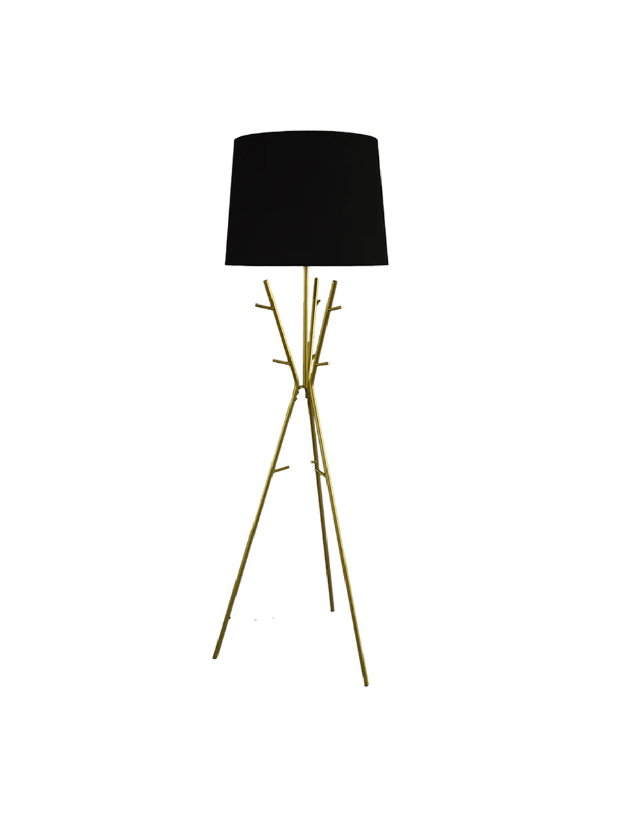 Podna svjetiljka Rami kombinira crno platneno sjenilo s elegantnim zlatnim stalkom za profinjen izgled. Izrađena s izdržljivim metalnim okvirom i visokokvalitetnim tekstilnim sjenilom, dodaje praktično osvjetljenje i vizualni karakter suvremenim životnim i garderobnim prostorima.