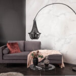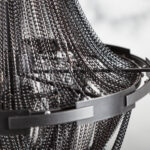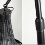 Podna svjetiljka načinjena od stotinu povezanih, finih metalnih lančića na postolju podesive visine.
