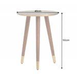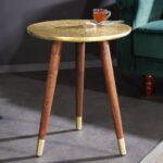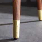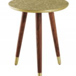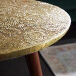Stolić Adelmo ima antikno zlatnu ploču, a postolje u obliku tronošca izrađeno je od lakiranog drva bagrema u smeđoj boji s dodatkom zlatnih čepova na dnu. Stolić je unikatan proizvod ručnog rada.