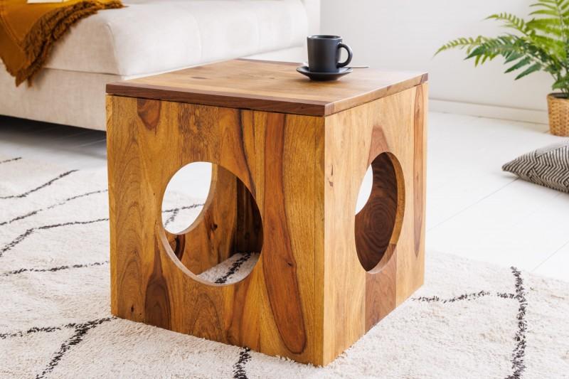 Ovaj stolić je izuzetno prilagodljiv, koristi se kao stolić uz kauč ili kao tabure. Izrađen je od masivnog, lakiranog sheesham drva prirodnog toniranja, čineći svaki primjerak unikatnim.