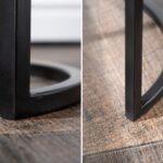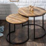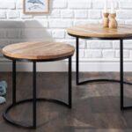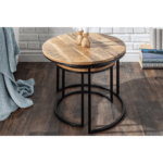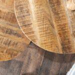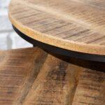 Okrugli stolić Aminta izrađen je od masivnog drveta manga s metalnim postoljem, ima prirodnu boju i rustikalni izgled zbog ručne izrade.