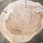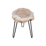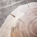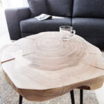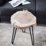 Ručno rađeni stolić okruglog oblika. Ploču stolića čini prirodno, puno drvo bagrema. Metalno postolje crne je boje.