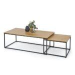 Dva praktična stola od MDF ploča u boji divljeg hrasta. Ploče su postavljene na crne metalne podloge i zahvaljujući mogućnosti skrivanja manje tablice ispod veće štedimo prostor.