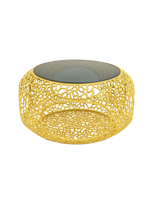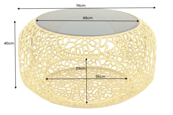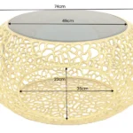 Stolić Noura spaja elegantno crno kaljeno staklo s odvažnom zlatnom metalnom bazom za profinjen izgled. Dizajniran da poboljša suvremene životne prostore, kombinira vizualni dojam s izdržljivom izradom i bezvremenskom elegancijom.