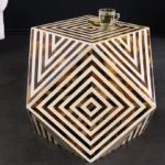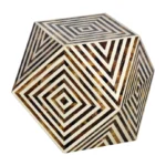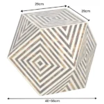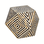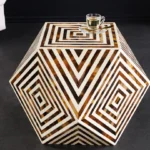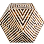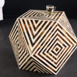 Istražite fascinantan svijet indijskih rukotvorina! Inspirirajte se stoljetnom tradicijom finog namještaja s zamršenim intarzijama i dodajte ekstravagantnu eleganciju svom domu koja će osvojiti vaša osjetila. Stolić Ramiel je pravo umjetničko djelo – njegova višeslojna površina i apstraktni oblici daju mu fascinantan izgled. Smeđa i bijela shema boja stvaraju kontrast i sklad. Pojedinačni koštani elementi s ljubavlju su ručno kombinirani kako bi stvorili umjetničke uzorke, što rezultira živopisnim i detaljnim izgledom koji definira poseban šarm ovog komada namještaja i dodaje jedinstven dodir vašem životnom prostoru. Doživite to sami!