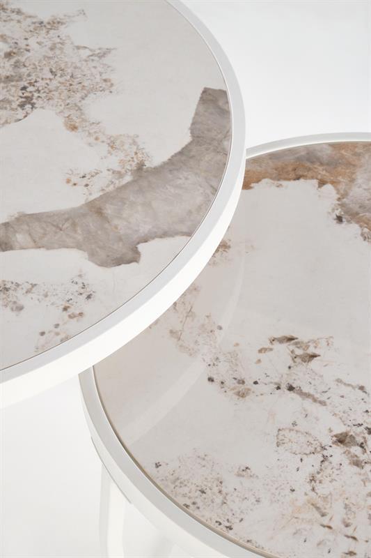 Stolić Senni elegantan je set izrađen od zanimljive kombinacije sinteriranog kamena u imitaciji mramora s metalnim postoljem.