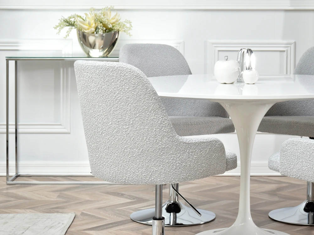 Okretna stolica Tadeo postavljena je na postolje koje se može podešavati – gore i dolje. Niski rukonasloni pridodaju na udobnosti ovog modela. BOCULE tkanina kojom je stolica obučena je karakterističan čvorasti materijal – vrsta punog pletiva. Površina materijala prekrivena je gustim i nepravilno raspoređenim čvorovima te ima nizak stupanj upijanja tekućine i izdržljiv je. Čelično postolje, u kombinaciji s navedenom tkaninom, svakom interijeru staviti će točku na i.