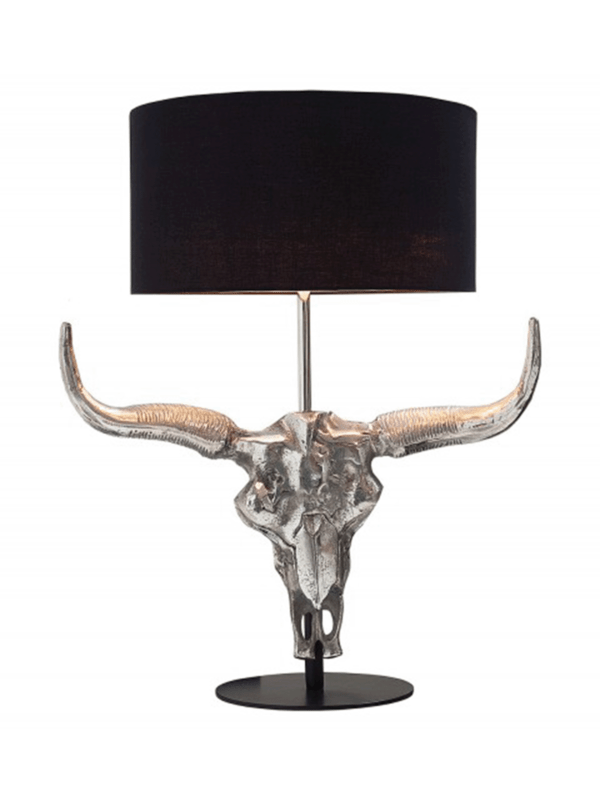 Neobična stolna svjetiljka Bull ima postolje od metal-aluminijske legure u obliku bikove glave, sa sjenilom od tkanine crnoj boji.