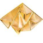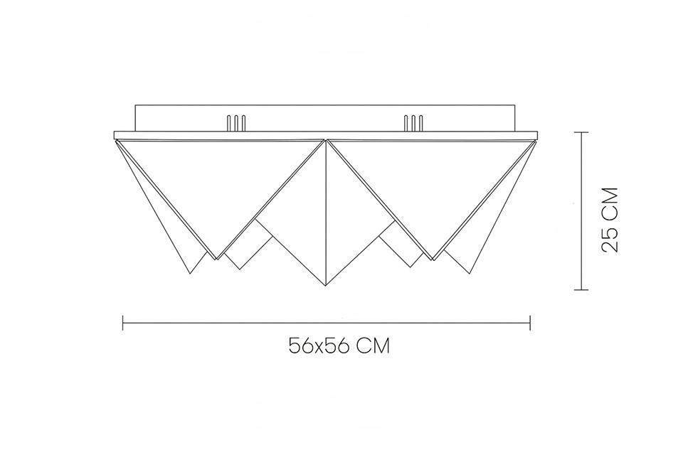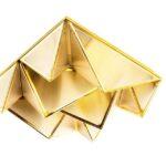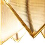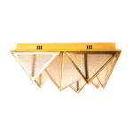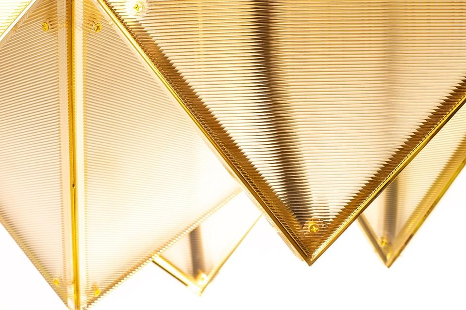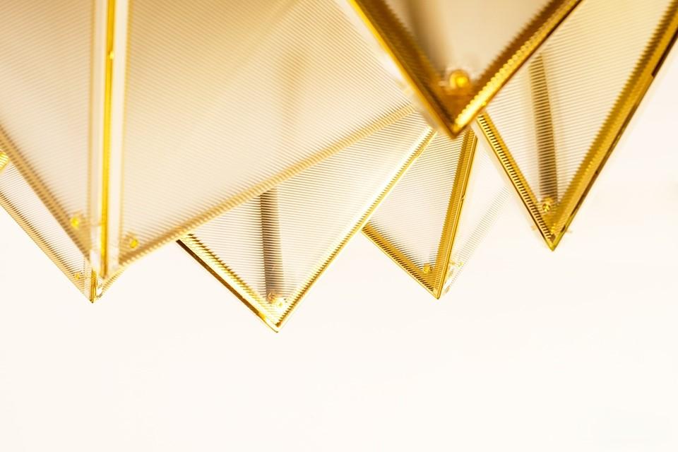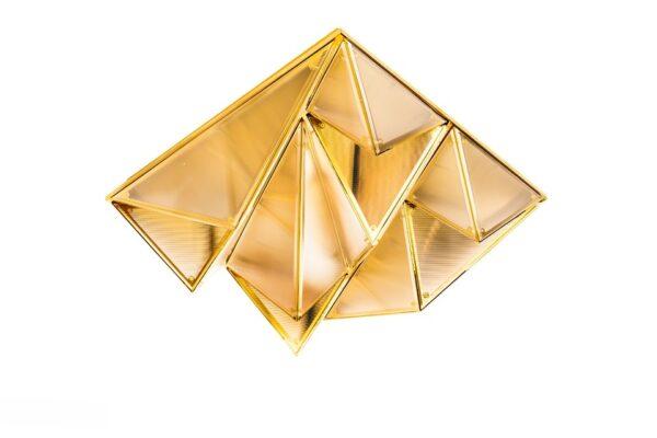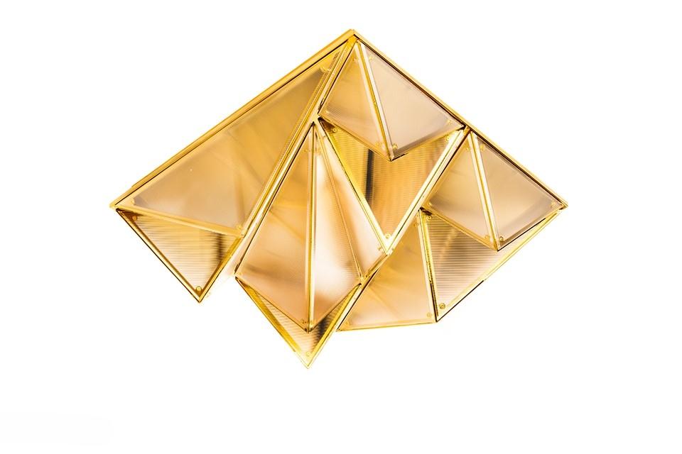 Metalna struktura stropne svjetiljke Pyramids podsjeća na zamršeno presavijeni origami u kojem trokutasti moduli stvaraju upečatljivu trodimenzionalnu kompoziciju. Zlatna završna obrada daje prepoznatljiv dekorativni karakter, a svjetlost koja prodire kroz akrilne površine nježno se raspršuje, stvarajući ugodnu atmosferu u prostoriji.