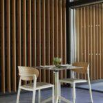 Ugostiteljska stolica s bezvremenskim linijama i geometrijom koja obuhvaća strukturu polipropilena ojačanog staklenim vlaknima s drvenim naslonom stolice. Zbog jednostavnog održavanja i skladištenja, UV zaštite koja štiti od sunčevih zraka te materijala koji je otporan na razne vremenske uvjete, vrlo je pogodna za ugostiteljske objekte, moderne terase, ali i blagovaonice.