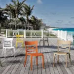 Ova stolica tradicionalnog stila izrađena je od polipropilena i ojačana stakloplastikom. Stolica dolazi u širokom izboru boja kako bi se stvorilo osvježavajuće okruženje. Lako se pohranjuje slaganjem jedne na drugu. Zahvaljujući UV premazu, otporna je na sve uvjete.