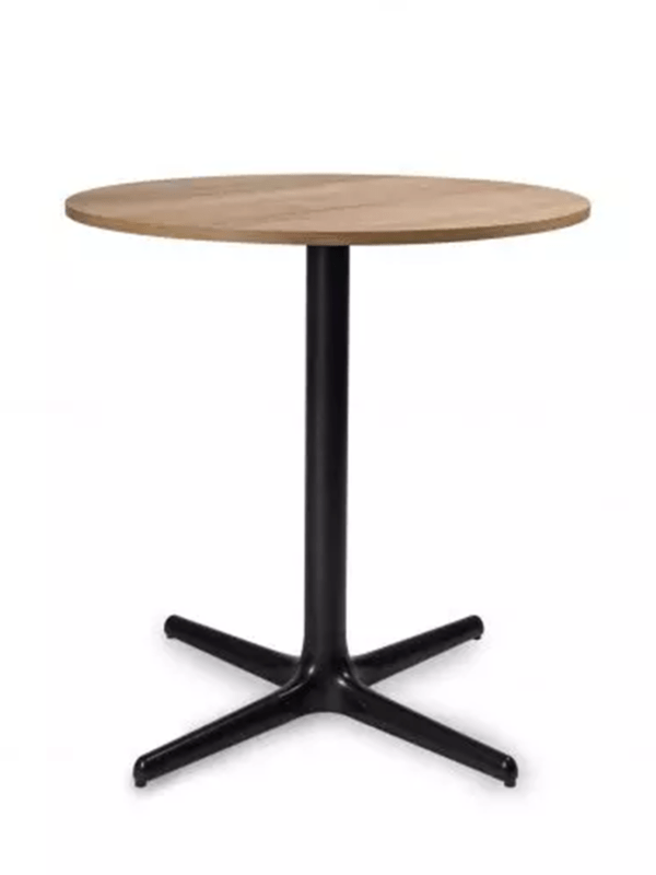 Ovaj okrugli stol je za unutarnju upotrebu. Postolje stola izrađeno je od obojanog aluminija dok je ploča stola napravljena od melamina – dvostrukog furnira s efektom drveta.