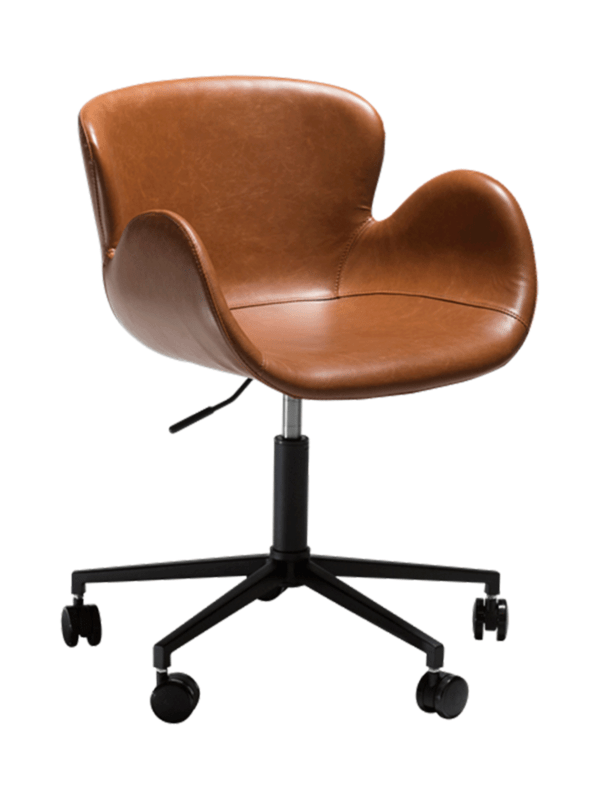 Ova elegantna uredska stolica ističe se svojim mekanim sjedištem i naslon presvučenim eko kožom vintage svijetlo smeđe boje, pozivajući na uživanje u dugim razgovorima za blagovaonskim stolom. Baza ove stolice crne je boje i ima 5 kotačića koji omogućuju slobodno kretanje po prostoru.