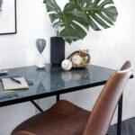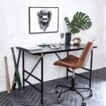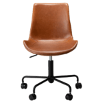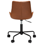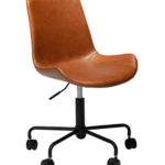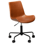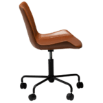 Stolica se ističe prepoznatljivim oblikom sjedala s detaljima poput šavova. Stolica je presvučena vintage svijetlo smeđom eko kožom, a crna baza ima nogice s 5 kotačića koji omogućuju slobodno kretanje po prostoru.