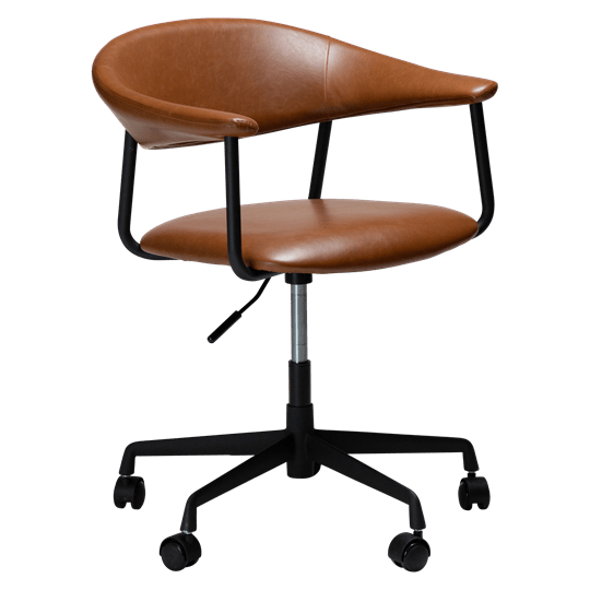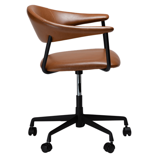 Stolica s naslonom koji se proteže u udobne rukonaslone ima dekorativne šavove i udobno sjedište. Presvučena je eko kožom vintage svijetlo smeđe boje. Baza ove stolice crne je boje i ima 5 kotačića koji omogućuju slobodno kretanje po prostoru.