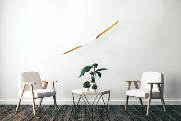 Visilica Conteo izrađena je od oblikovanog aluminija u mat crnoj boji. Unutarnja strana sjenila u zlatnoj boji savršeno raspršuje svjetlost, stvarajući ugodan svjetlosni efekt.